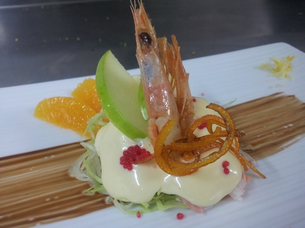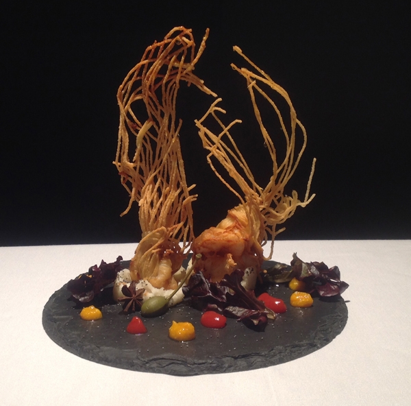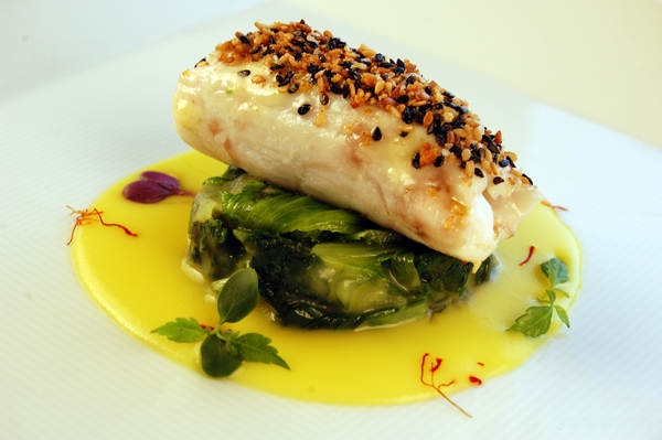 020 - Involtino di pezzogna ripieno di scampi in crosta di sesamo su tortino di scarola e salsa allo zafferano di Carlo Spina da Napoli |